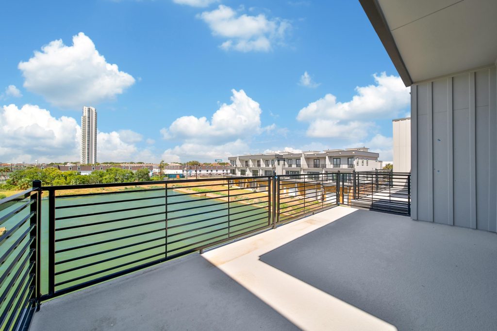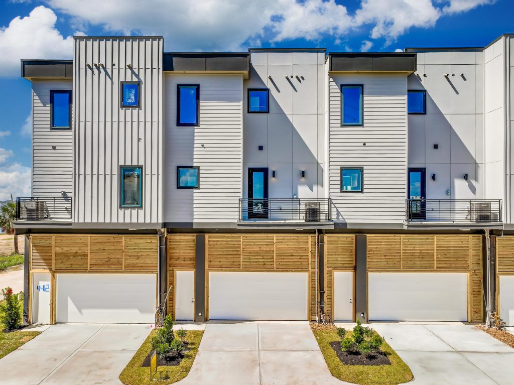 Modern white three-story townhouses with black trim, each featuring a balcony and a two-car garage, set against a blue sky with a few clouds and some landscaping out front.