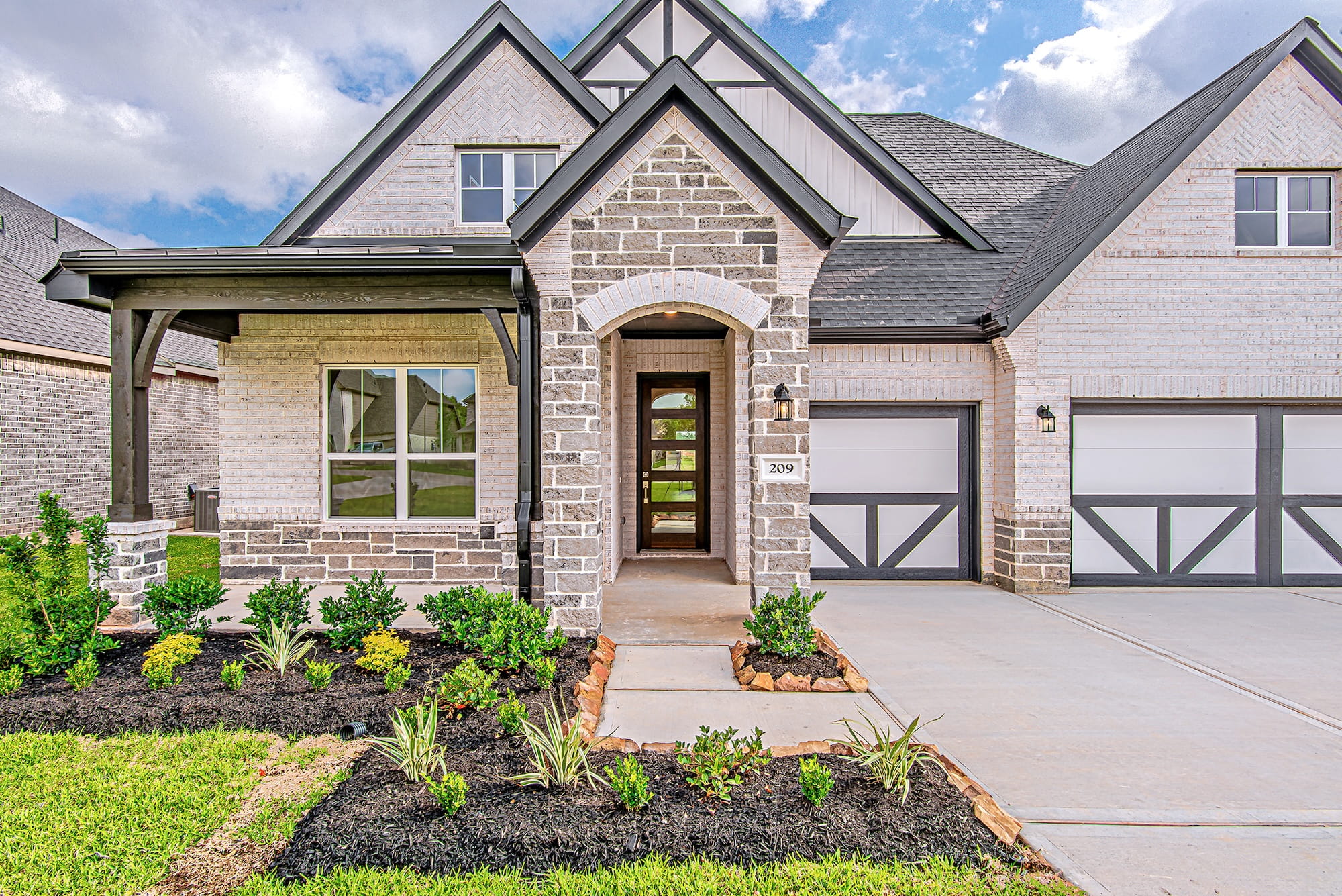 Modern two-story house with white and gray brick exterior, large windows, and a dark double garage door. Manicured lawn and shrubs in front, with tall trees in the background under a partly cloudy sky.