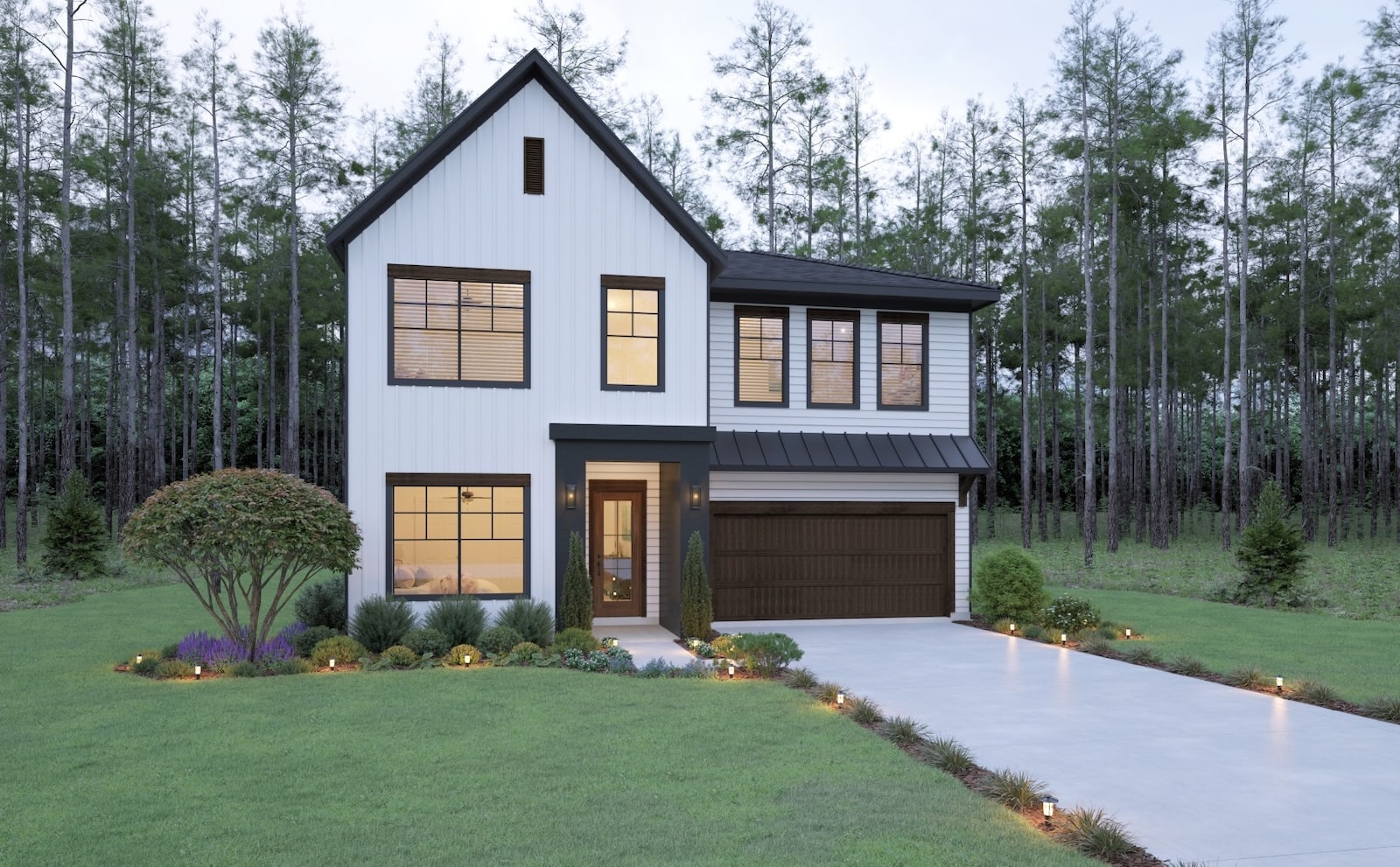 A two-story modern suburban house with white siding, gray accents, and a double garage. Warm lights illuminate the windows and landscaped front yard with bushes and trees, surrounded by a wooded area.