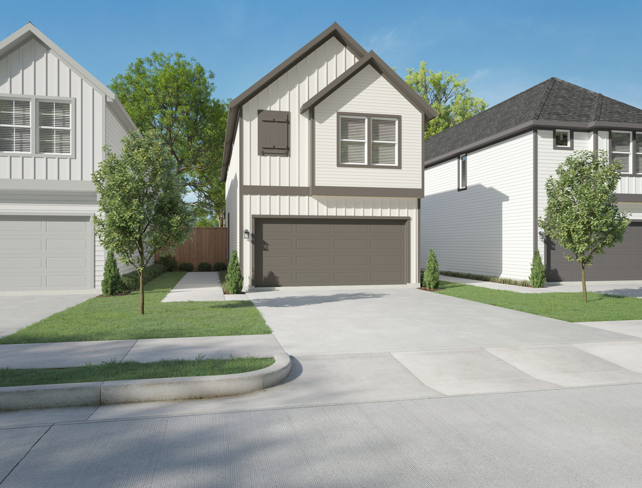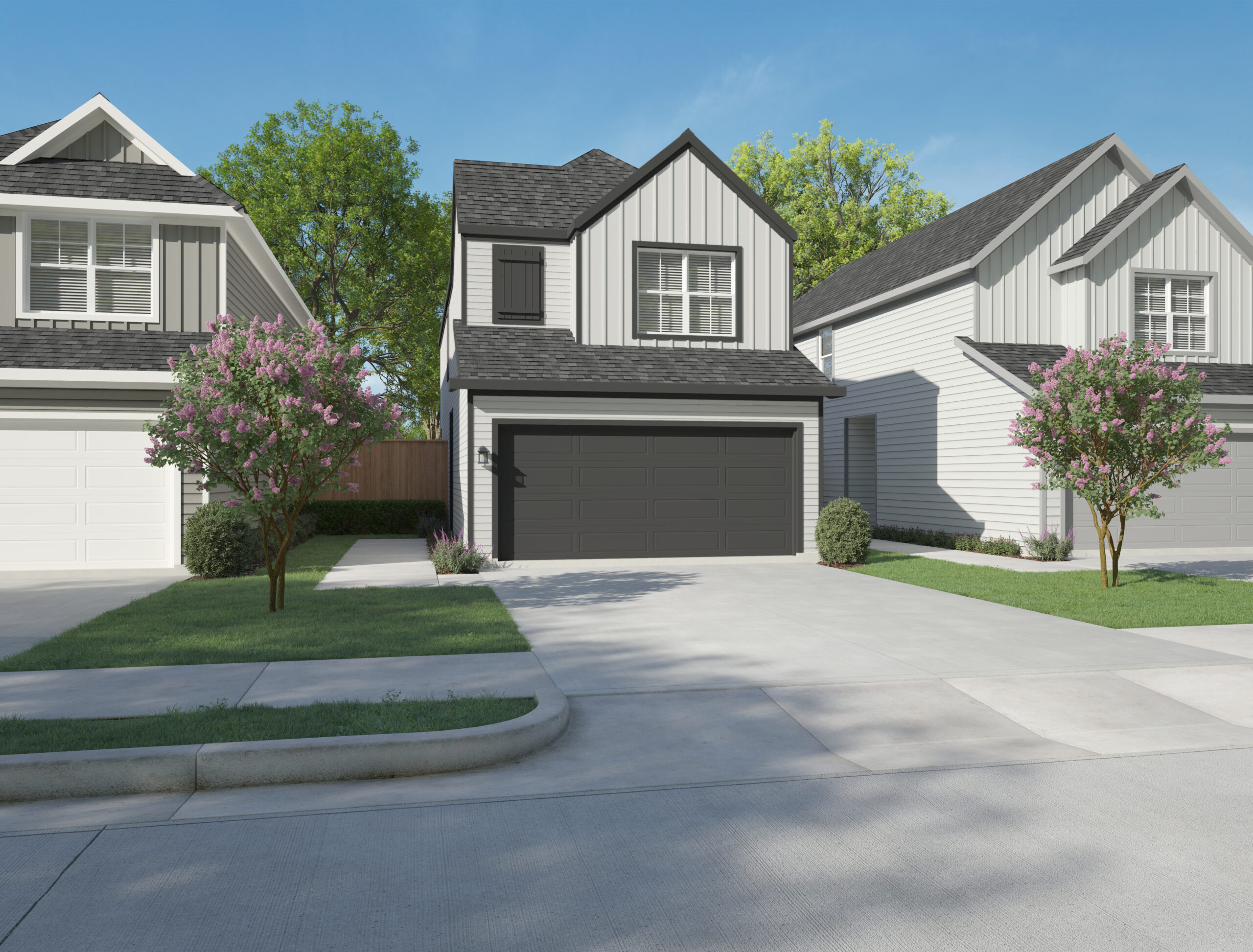 A modern single-story house with white siding, dark trim, and a dark garage door, surrounded by a well-kept lawn and trees in the background. A concrete driveway leads to the garage.