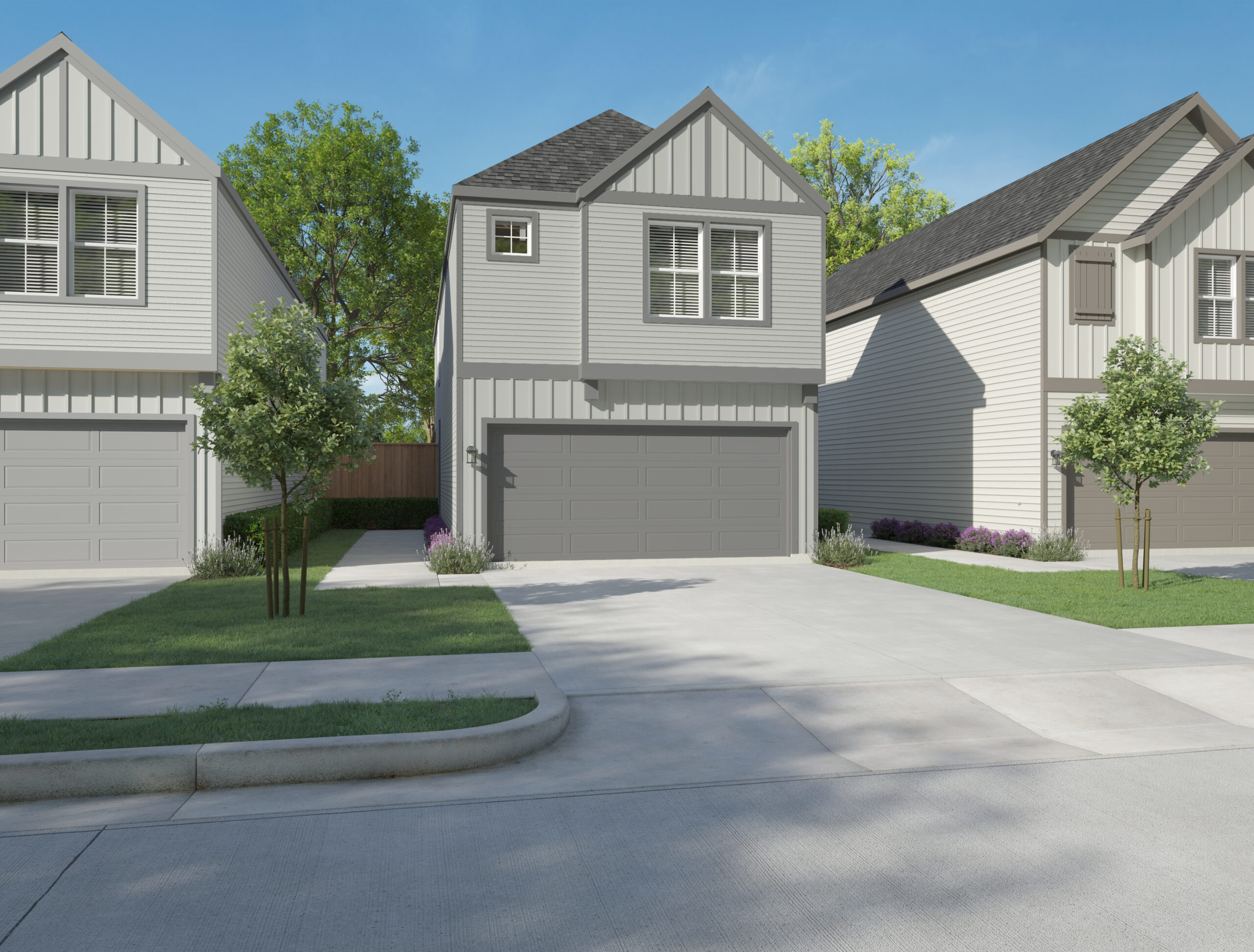 A modern single-story house with gray siding, a dark gray garage door, and a landscaped front yard with shrubs and flowers, set against a backdrop of tall trees and greenery.